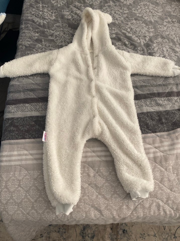 Kapüşonlu ve kürklü detaylı beyaz bebek tulumu, yumuşak ve sıcak tutan dokusuyla konfor sağlar. Desensiz ve rahat bir yapıya sahiptir.