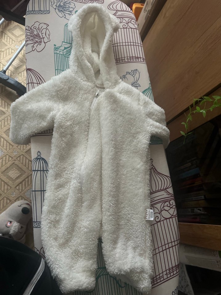 Kapüşonlu, kürklü detaylı beyaz bebek tulumu, yumuşak ve sıcak tutar. Fermuarlı ve desensiz, açık gri tonlarında bir tasarıma sahiptir. ❄️