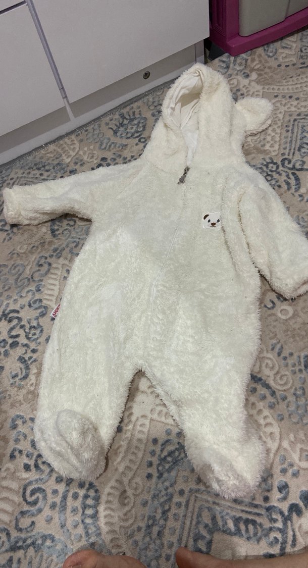 Kapüşonlu, yumuşak kürk dokulu beyaz bebek tulumu, küçük ayıcık detaylıdır. Sıcacık tutar.