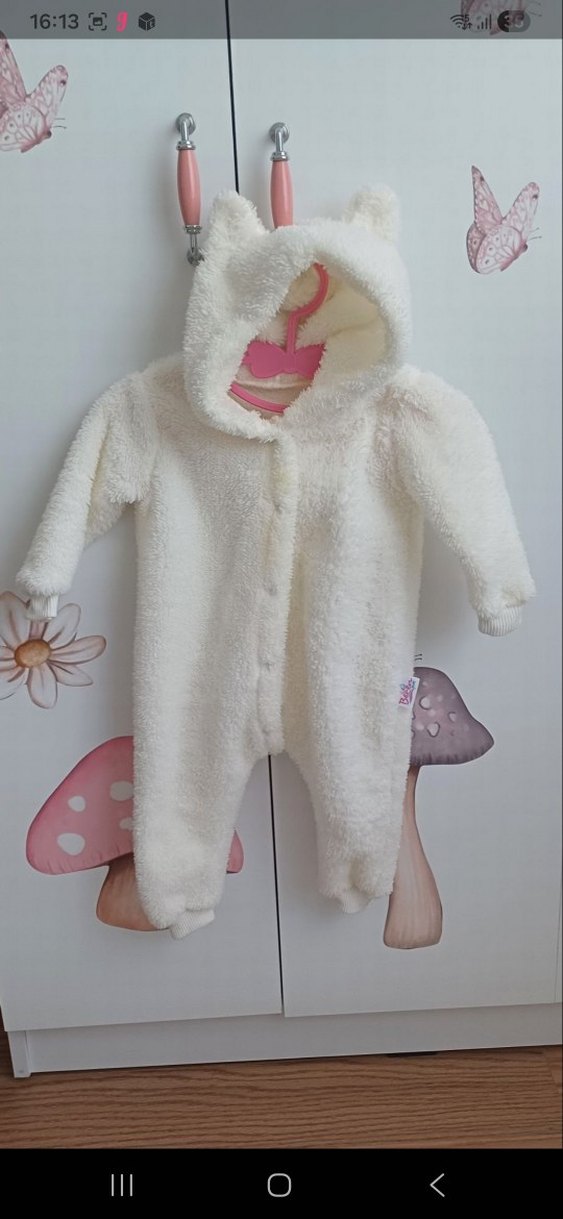Pastel beyaz renkte, kapüşonlu ve kürk detaylı, desensiz yumuşak dokulu bebek tulumu. ❄️