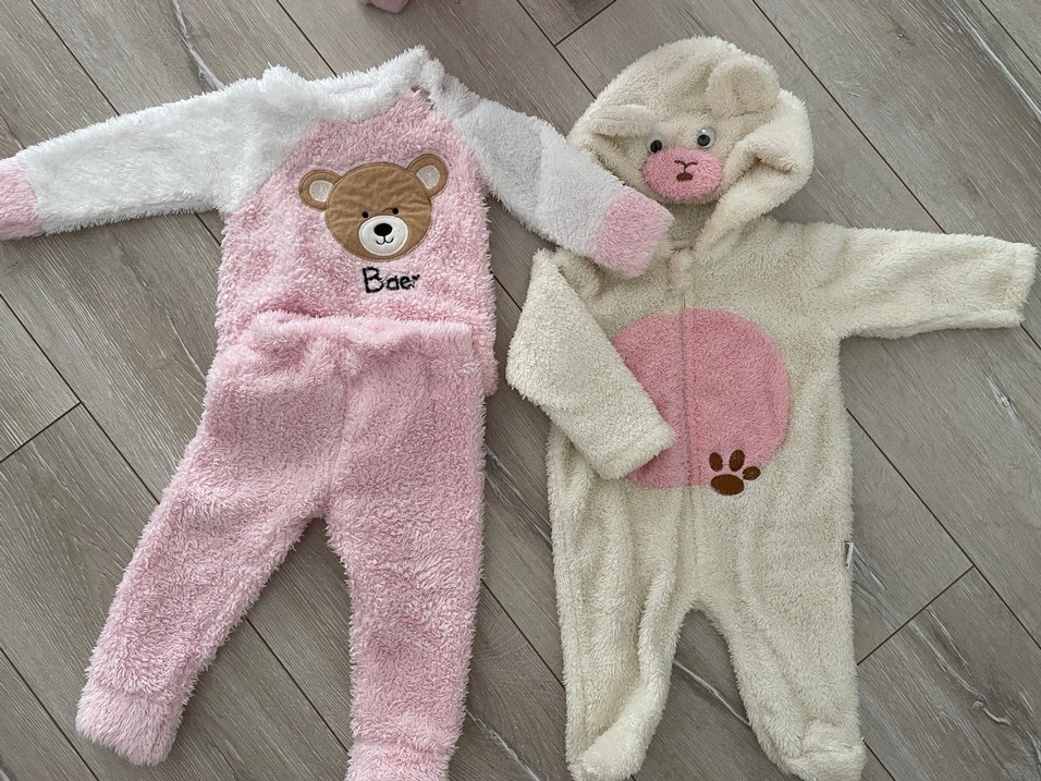 Yumuşak kürklü, kapüşonlu beyaz bebek tulumu. Pastel işlemeli detaylar ve sevimli ayı figürü içerir. ❄️ Çok iyi durumdalar