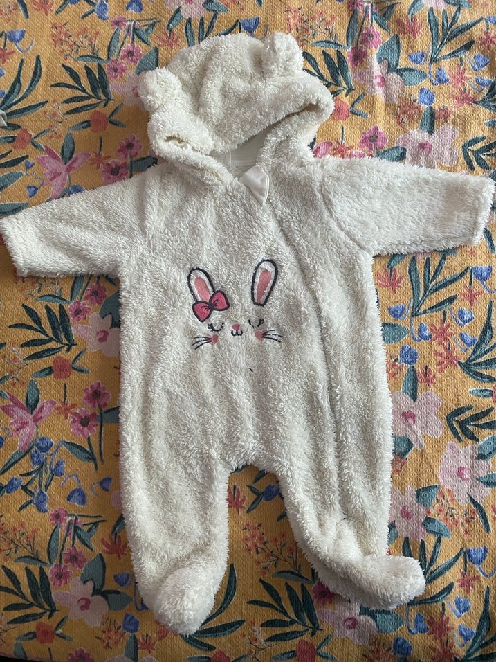 Kapüşonlu, kürklü ve nakışlı tavşan desenli beyaz bebek tulumu, pastel tonlarda.