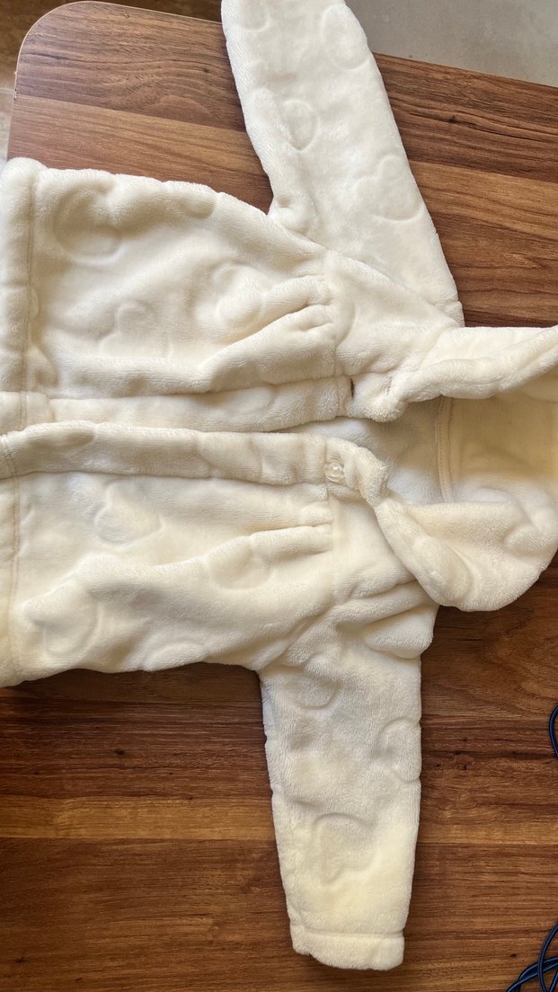 Kapüşonlu, kürklü detaylı beyaz bebek tulumu. Düz ve yumuşak dokulu kumaşa sahip, sıcak tutan rahat bir modeldir. ❄️