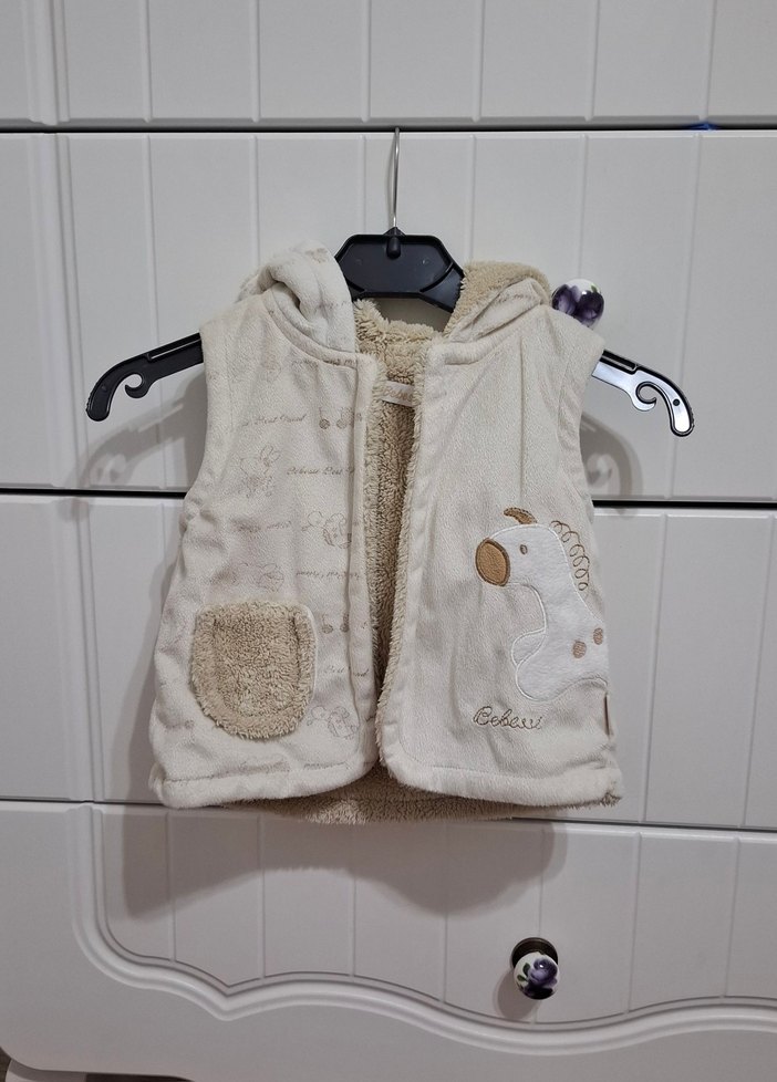 Kapüşonlu, kürklü detaylı beyaz kız çocuk yeleği. Baskılı desen ve küçük cep ile rahat kesim, günlük sokak stiline uygun.