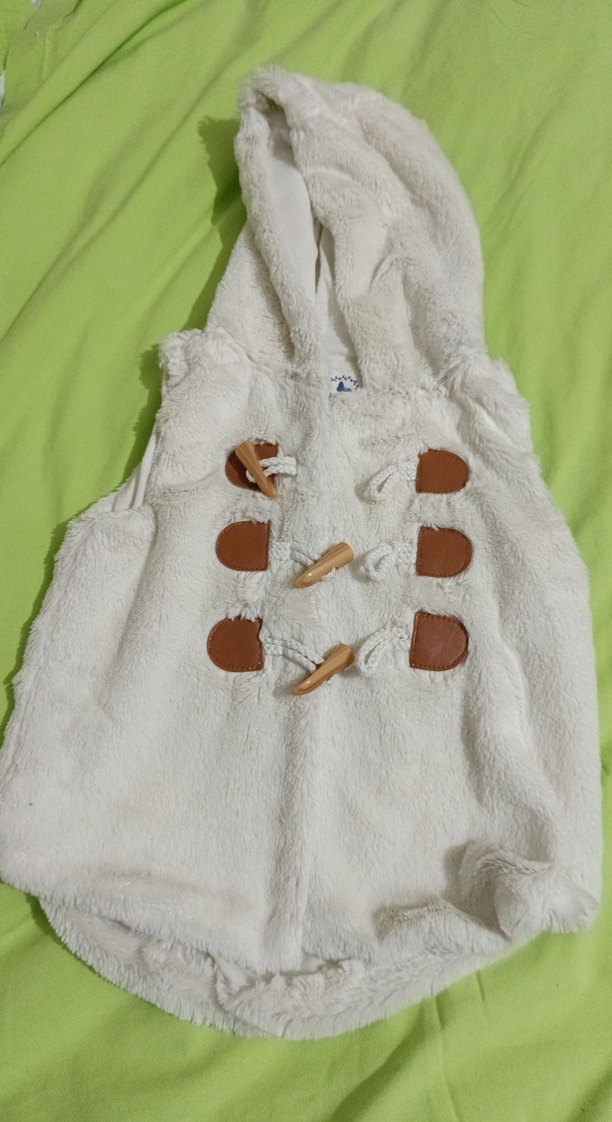 Kapüşonlu, kürklü beyaz yelek, ahşap çıtçıt detaylıdır. Yumuşak ve sıcak dokusu ile bohem tarzda, dar kesimdir.