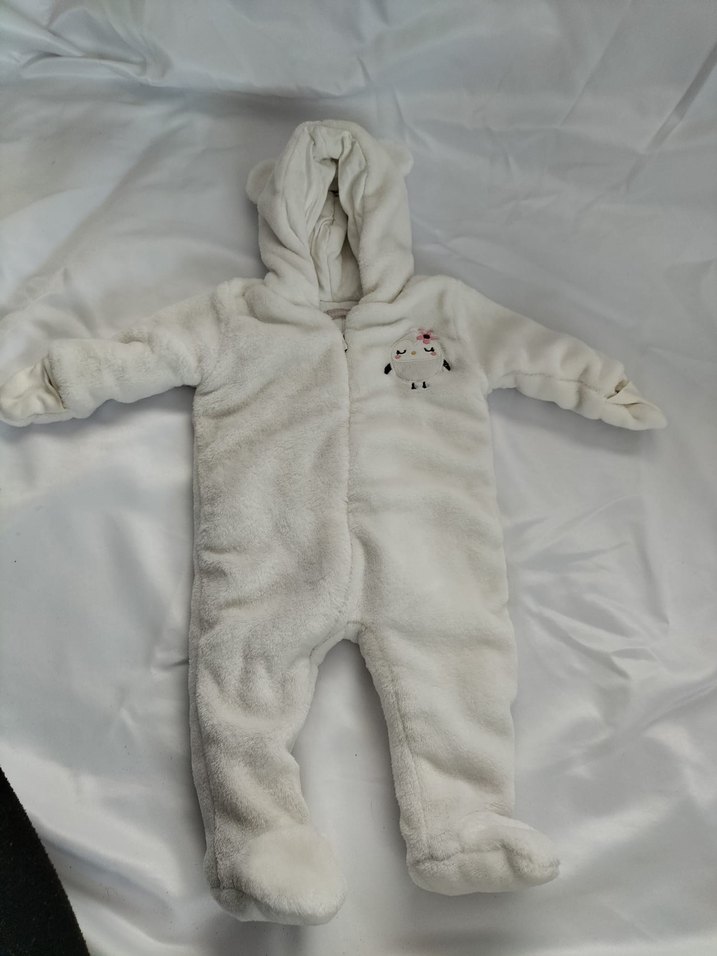 Kapüşonlu ve kürklü detaylı beyaz bebek tulumu, nakışlı desenlere sahiptir. Yumuşak ve sıcak tutar.