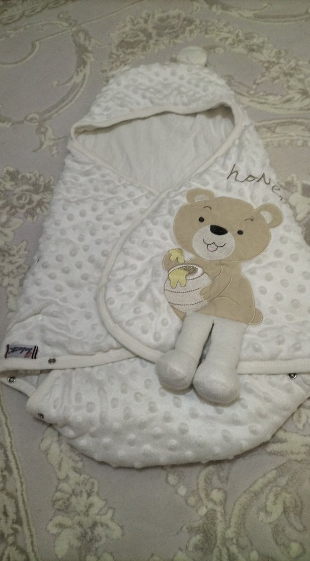 Yumuşak dokulu beyaz bebek kundak kapüşonlu ve nakışlı ayıcık deseniyle sıcak tutar.