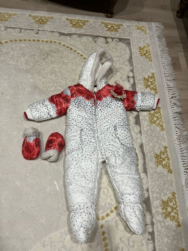 Kapüşonlu, nakışlı ve kürk detaylı beyaz bebek tulumu. Kırmızı çiçek desenleri ve uyumlu eldivenlerle tamamlanmıştır. Soğuk havalar için sıcak tutar. ❄️