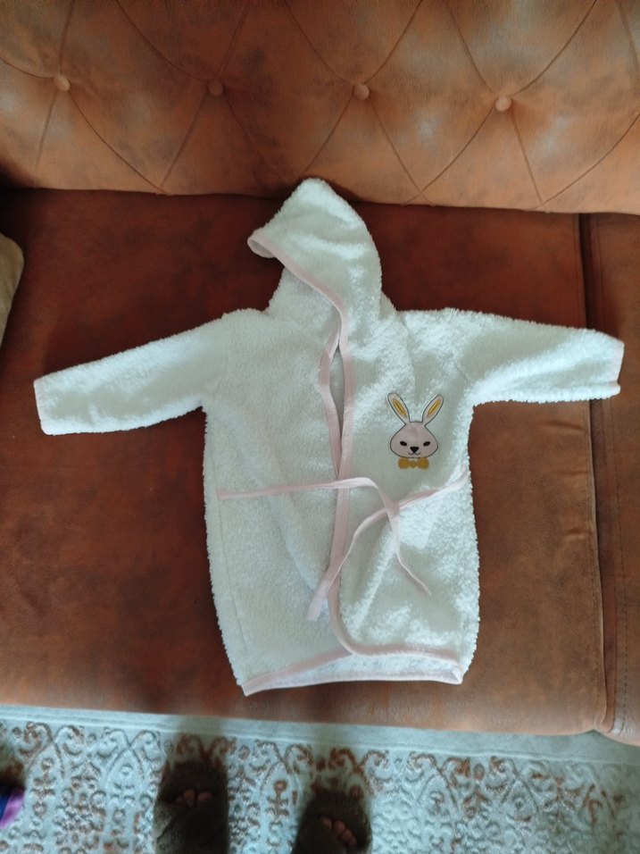 Kapüşonlu, yumuşak ve sıcak beyaz kız bornozu, nakışlı tavşan detayıyla. Kemerli, rahat kullanım sağlar.