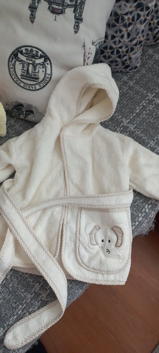 Yumuşak ve sıcak kumaştan yapılmış, kapüşonlu ve nakışlı detaylara sahip beyaz kız bornozu, kemer ile sabitlenir. 0-1 yaş arası kullanilabilir