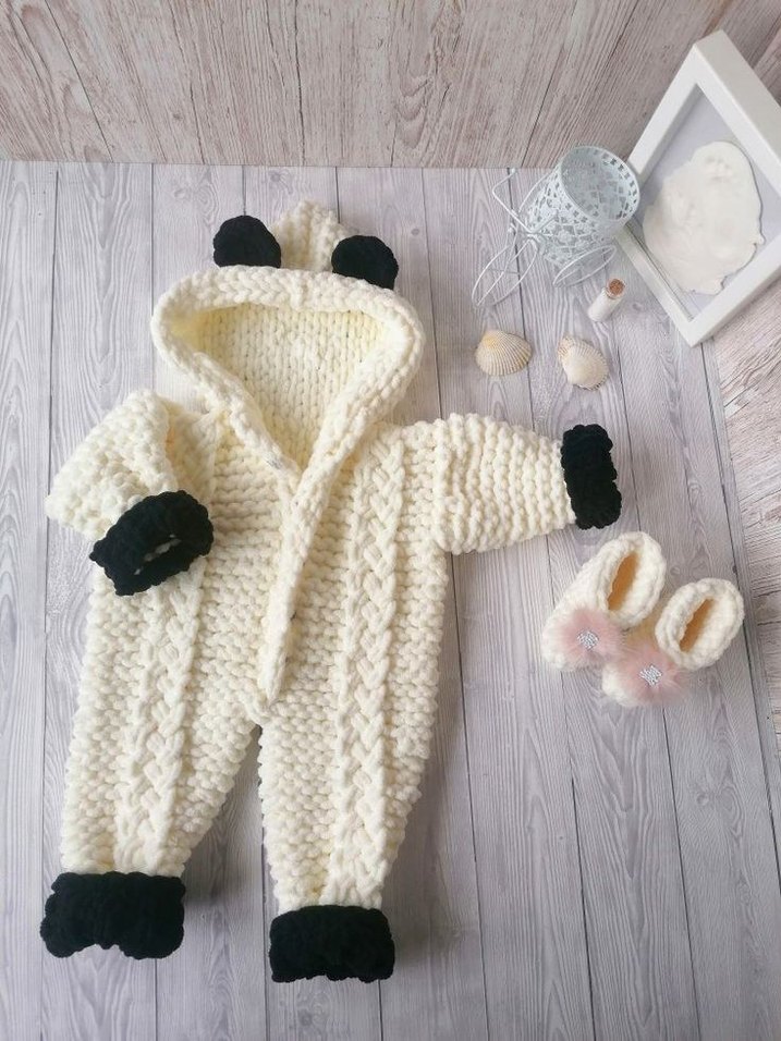 Kapüşonlu, siyah detaylı, hafif beyaz örgü bebek tulumu, sıcak tutar ve konfor sağlar.
