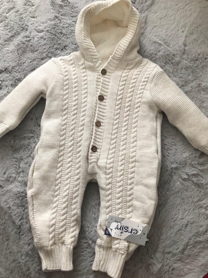 Kapüşonlu Beyaz Örgü Bebek Tulumu