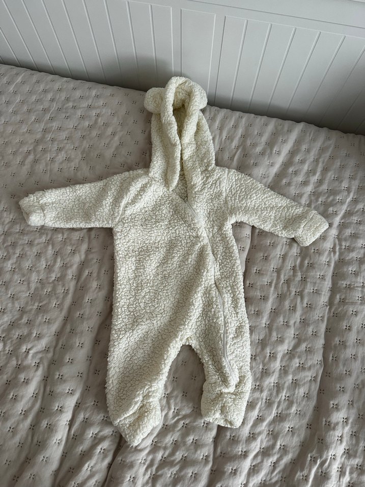 Kapüşonlu ve peluş detaylı beyaz bebek tulumu, yumuşak dokusuyla sıcak tutar. Desensiz sade tasarıma sahiptir. ❄️