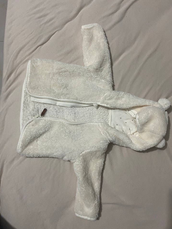 Etiketini kesmişim h&m olması lazım. Birkaç kez kullanıldı. Sorunsuz. Kapüşonlu, beyaz renkli kız bebek tulumu, yumuşak peluş detaylara sahiptir. Açık gri tonlarında, desensiz tasarımıyla sıcak tutar. ❄️