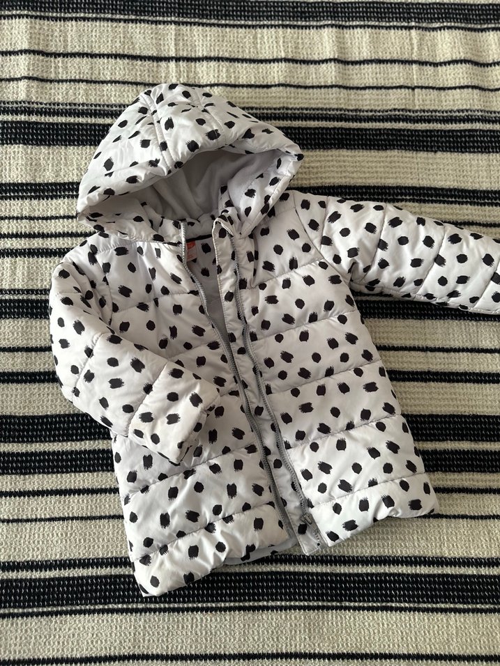 Beyaz zemin üzerine siyah puantiyelerle kapüşonlu, kürk detaylı kız montu. Yumuşak fleece kumaştan yapılmış, gri tonlarda ve sokak modası tarzında.