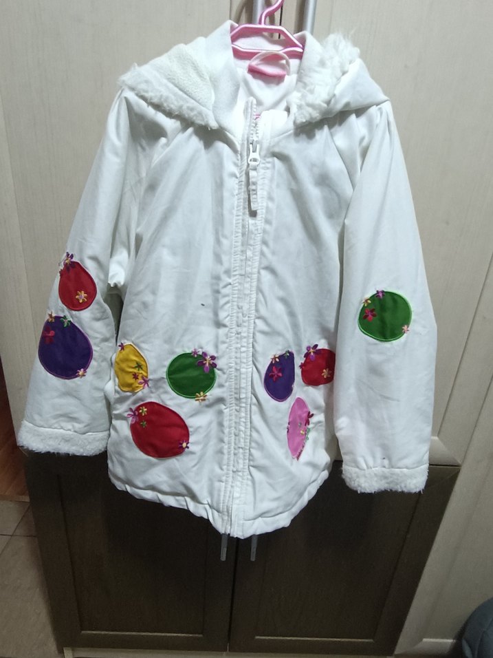 Kapüşonlu beyaz renkli kız mont, bol kesim ve renkli baskılarla. Yumuşak ve sıcak kumaştan, rahat ve şık bir seçimdir.