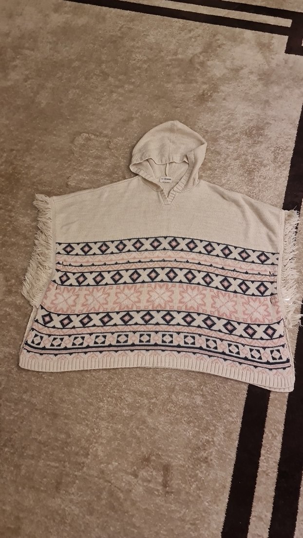 Gri renkli, kapüşonlu ve bol kesim kız pançosu, nakışlı bohem desenlere sahip. Uzun kollu ve püsküllü detayları bulunur.