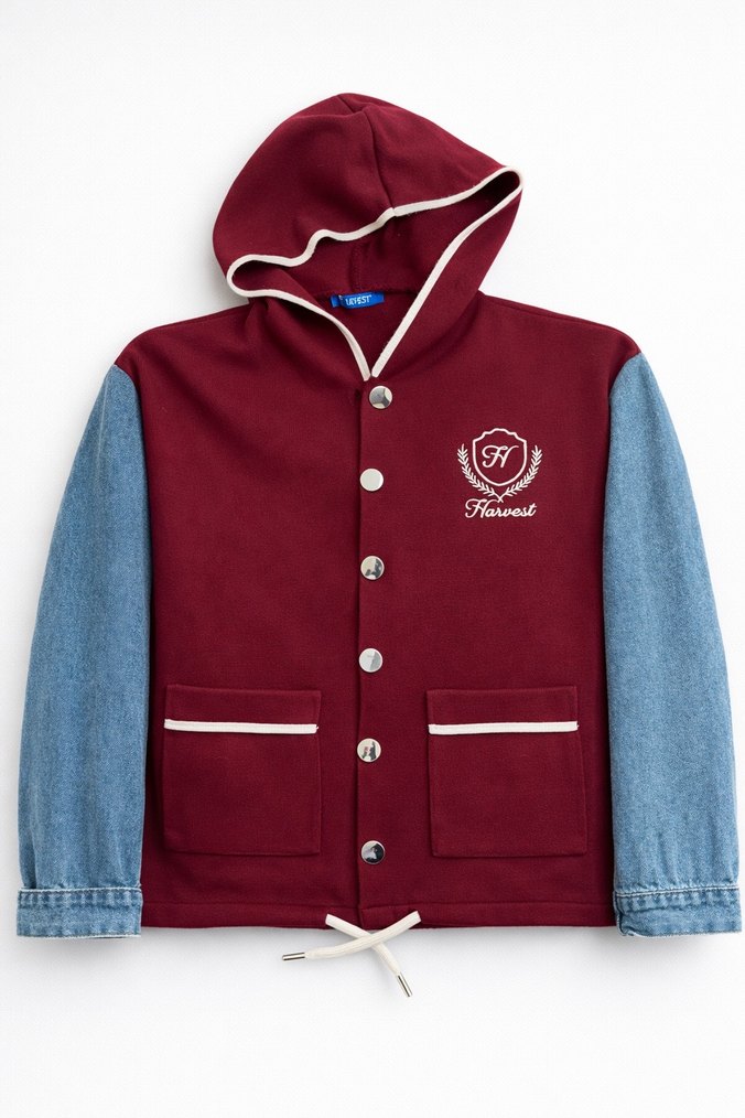 Kapüşonlu ve düğmeli ceketi, bol kesimdir. Bordo gövde ve parlak açık mavi kollarıyla trend sokak tarzı sunar. Yumuşak ve sıcak kumaştan üretilmiştir.