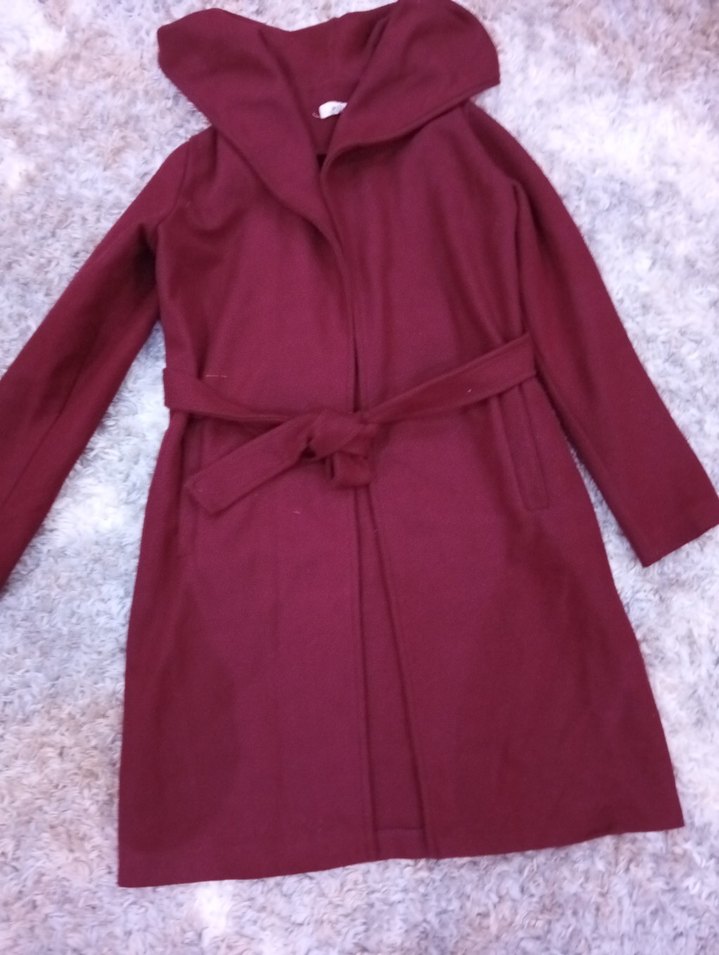 Kapüşonlu ve belden bağlamalı bordo kaban. Yumuşak ve sıcak kumaştan üretilmiştir, uzun kolludur.