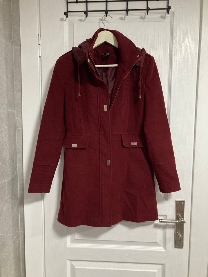 Kapüşonlu ve ön cepli, bordo renkte, yumuşak ve sıcak kumaştan kadın kabanı. İnce kesim ve ön fermuarlı kapanışa sahiptir. Sayan marka, yakada ve bileklerde dikiş detayları mevcut. Çok şık ve kaliteli bir kaban. Boyu diz üstüne gelir. Hamilelik ve doğum nedeniyle sayılı kullanıldı. Piyasada zor bulunacak nitelikte tertemiz bir üründür.