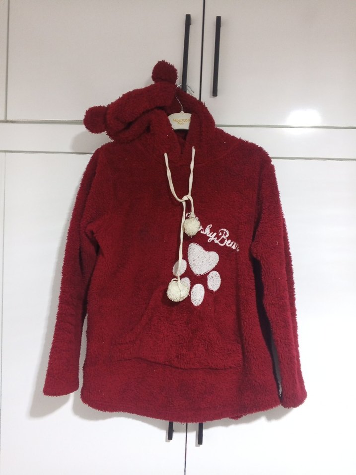 Bordo renkli, kapüşonlu polarlı sweatshirtü. Rahat kesimi ve renkli baskısı ile günlük kullanım için uygundur. . sıcak tutar. kolları biraz aşınmış. L beden