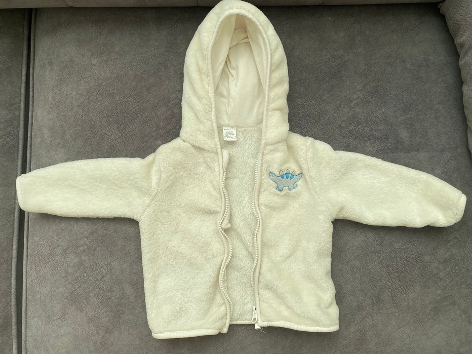 Kapüşonlu ve fermuarlı, yumuşak ve sıcak kumaştan yapılmış, pastel beyaz renkte, nakışlı dinozor detaylı erkek bebek ceket deforme yoktur yıkadım kaldırdım