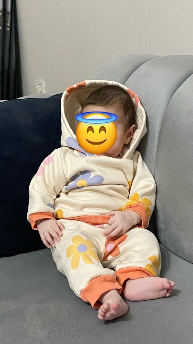 Kapüşonlu, pastel beyaz renkte, çiçek desenli ve kabarık yapıda bebek kız tulumu. Yumuşak ve sıcak tutar. Yalnızca 1 kez giyildi