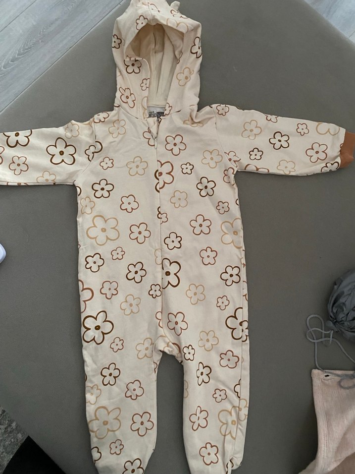 Kapüşonlu, renkli çiçek desenli bebek tulumu, detaylarıyla sıcaklık ve konfor sunar. ❄️ hiç giyilmedi