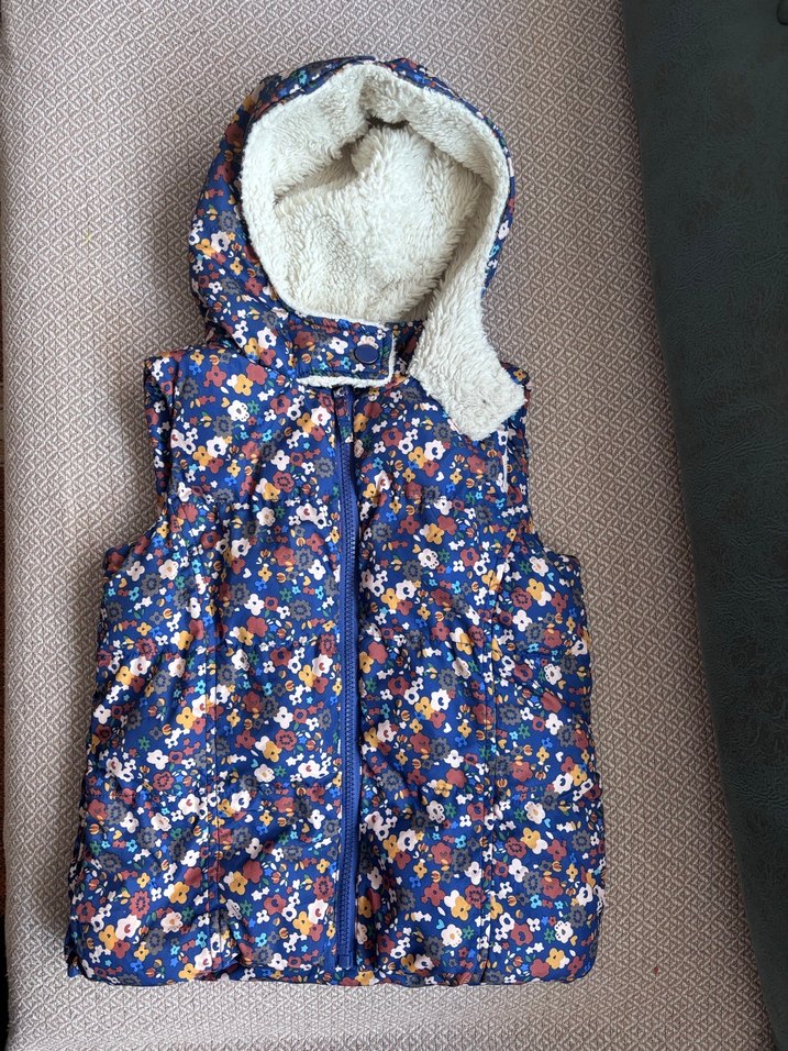 Kapüşonlu, yumuşak kürk astarlı, çiçek desenli renkli kız yeleği. Sokak stili için uygun, kolsuz ve vücuda oturan kesim.