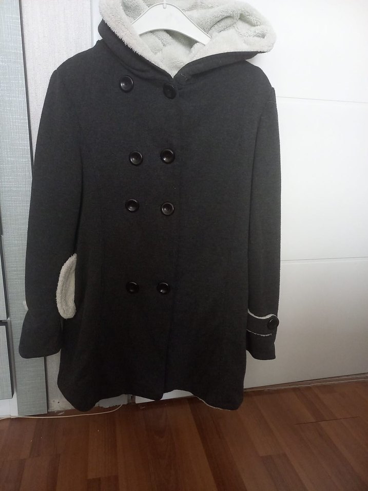 Kapüşonlu, çift düğmeli, içi yumuşak ve sıcak kumaş kaplı kaban. Ceplerde de aynı detaylar bulunur.