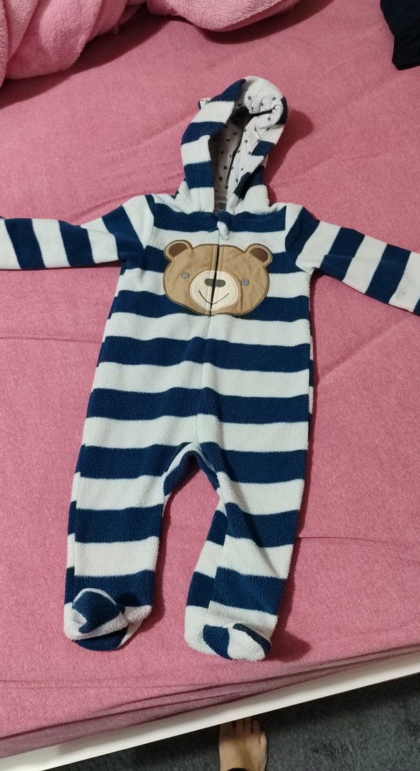 Knitted tulum, uzun kollu ve kapüşonlu. Önünde ayı baskısı olan renkli çizgili desenli, yumuşak ve sıcak kumaştan yapılmıştır.