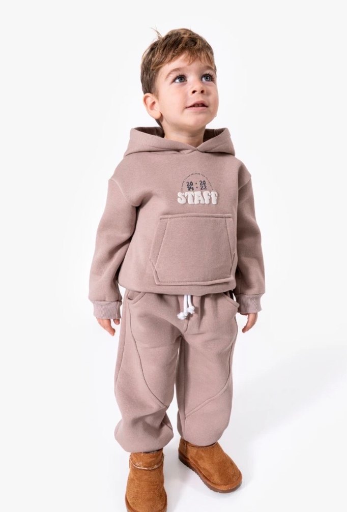 Yumuşak ve sıcak kumaştan yapılmış, bol kesim kahverengi kapüşonlu sweatshirt ve eşofman altı takımı 2/3/4 yaş bedenleri mevcuttur