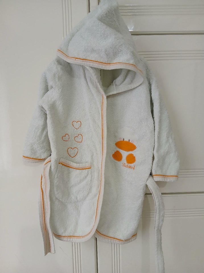 Çok az ve temiz kullanılmıştır.Bu beyaz çocuk bornozu, yumuşak dokulu, nakışlı kalpler ve sevimli ördek deseni içerir. Kapüşonlu, ön cepli ve kemerlidir.