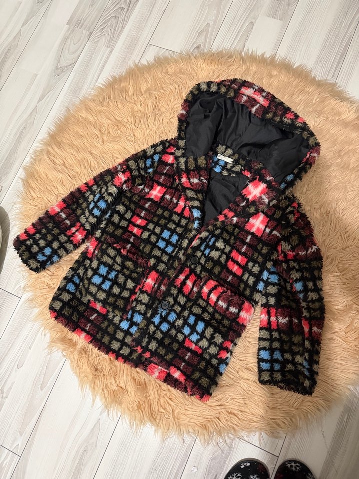 Kapüşonlu, çok renkli tie-dye desenli bohem tarzı kız çocuk kabanı. Yumuşak kürk detaylı, bol kesim ve rahat bir sokak giyimi ürünü.