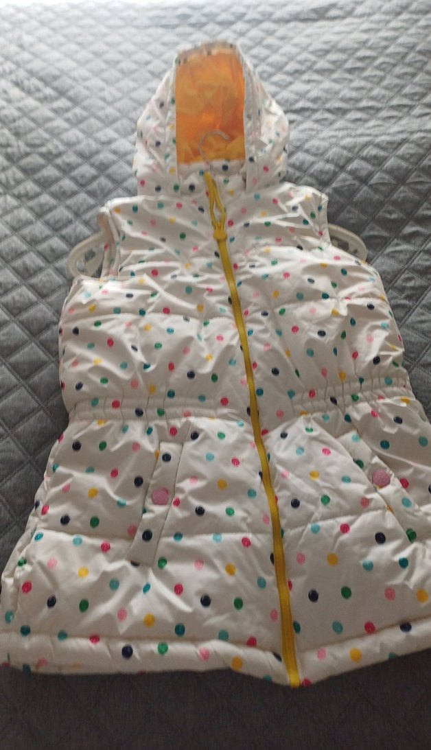 Kapüşonlu, fermuarlı, çok renkli puantiyeli kız yeleği. Sentetik kumaştan, dar kesim ve sokak tarzına uygun.