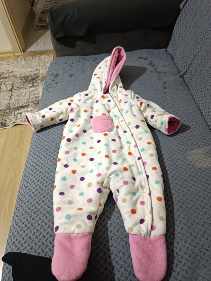Kapüşonlu, örgü bebek tulumu, pastel çok renkli puantiyelerle süslü, ayak ve manşetlerde pembe detaylar bulunur. Yumuşak ve sıcak tutar. ❄️