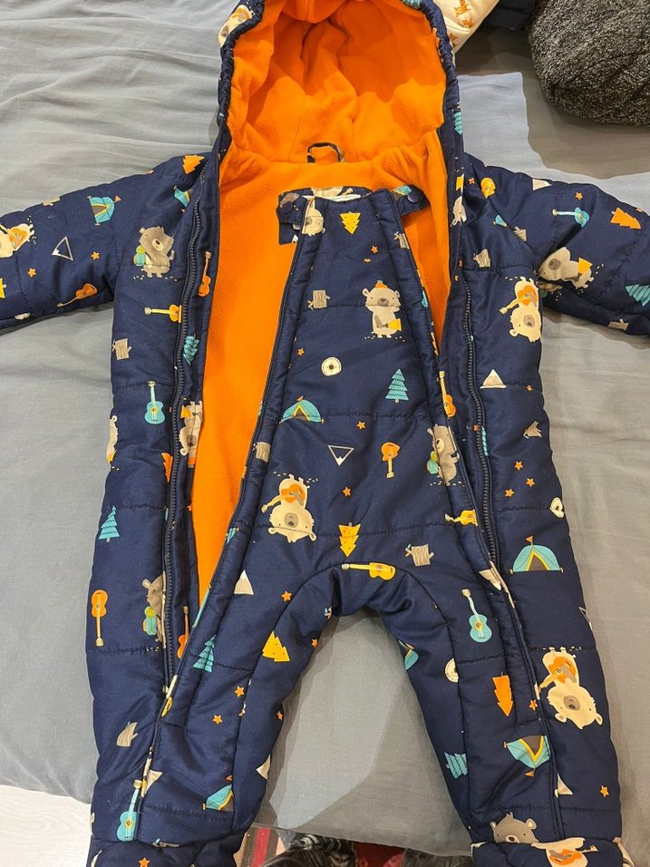 Koyu renkli, desenli ve fermuarlı bebek tulumu. Yumuşak ve sıcak tutan polar kumaştan, sokak stili tasarımda. çok iyi durumda hiç bir sorunu defosu yok 9-12 ay uyumlu