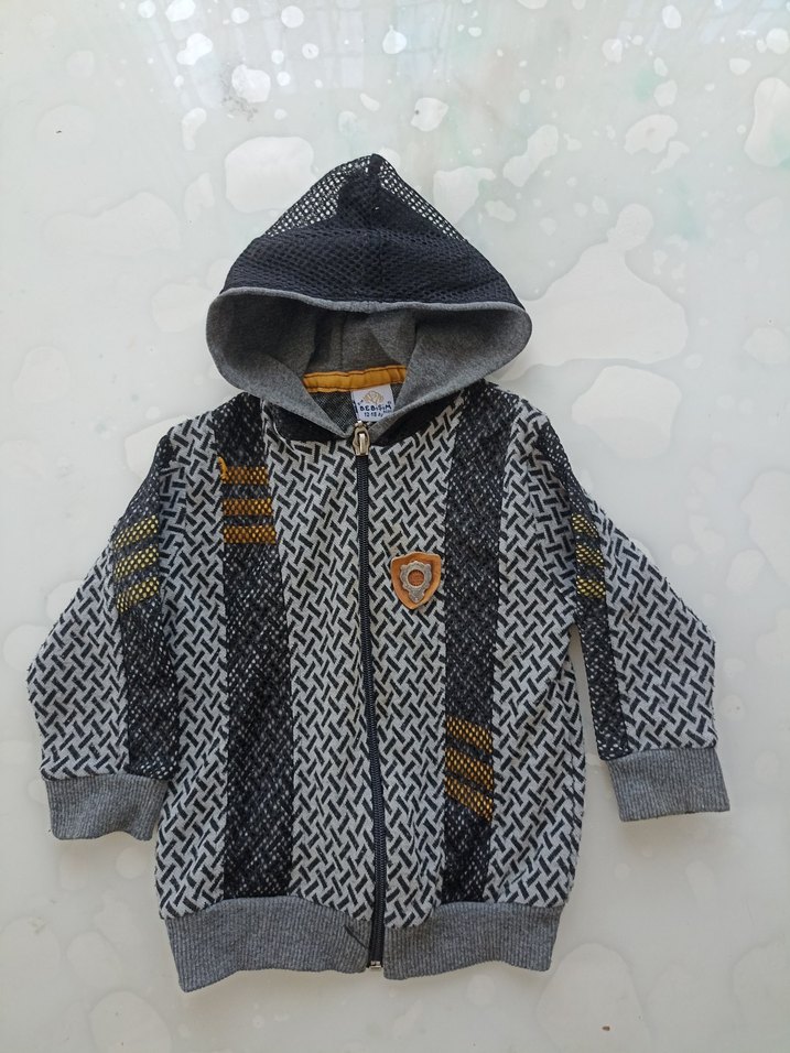 Kapüşonlu ve uzun kollu, yumuşak ve sıcak dokulu örgü kumaştan yapılmış, fitted kesime sahip gri desenli erkek çocuk sweatshirt. Önde fermuar ve ribana manşetler bulunur.
