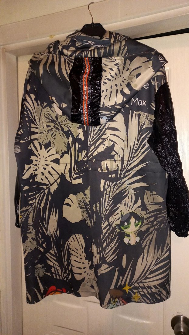 Kapüşonlu ve fermuarlı, bol kesim yağmurluk. Sentetik kumaştan, koyu gri desenli ve sokak modası tarzında. "Max" yazısı ve özel detaylar içerir. ️