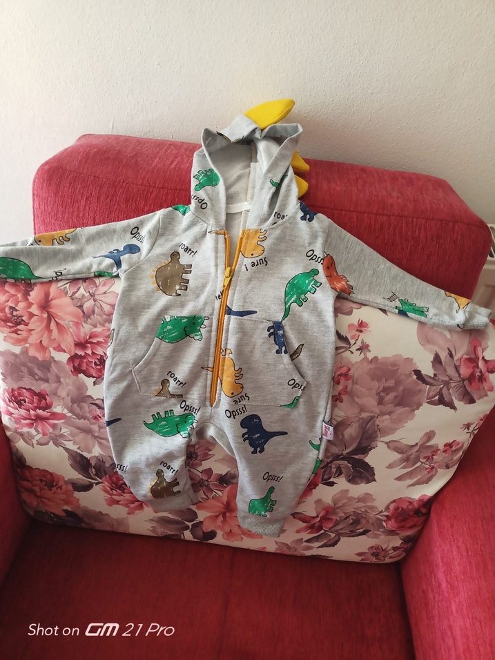 Gri renkte, kapüşonlu ve renkli dinozor baskılı, yumuşak kumaştan yapılmış bebek tulumu.