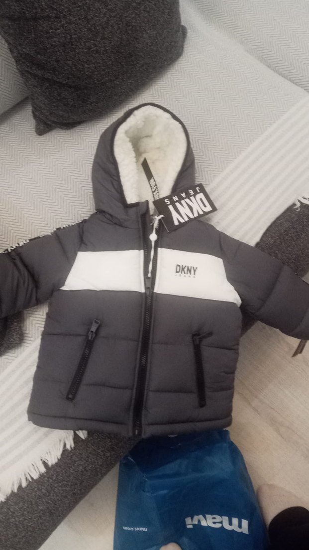 Erkek çocuklar için kapüşonlu, kürklü detaylı ve baskılı DKNY logolu, yumuşak kumaştan gri mont. Trendy sokak tarzına uygun, normal kesim.