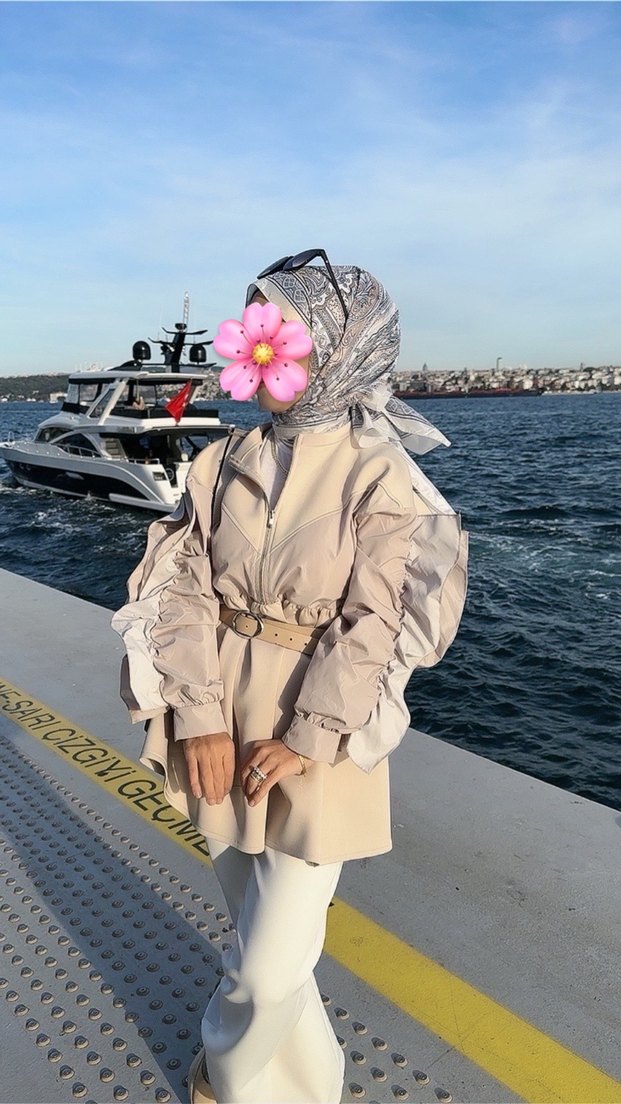 Kapüşonlu, drapeli uzun kollu kısa kadın yağmurluğu, etnik desen detaylarıyla. Sentetik kumaştan, günlük kullanıma uygun. ️