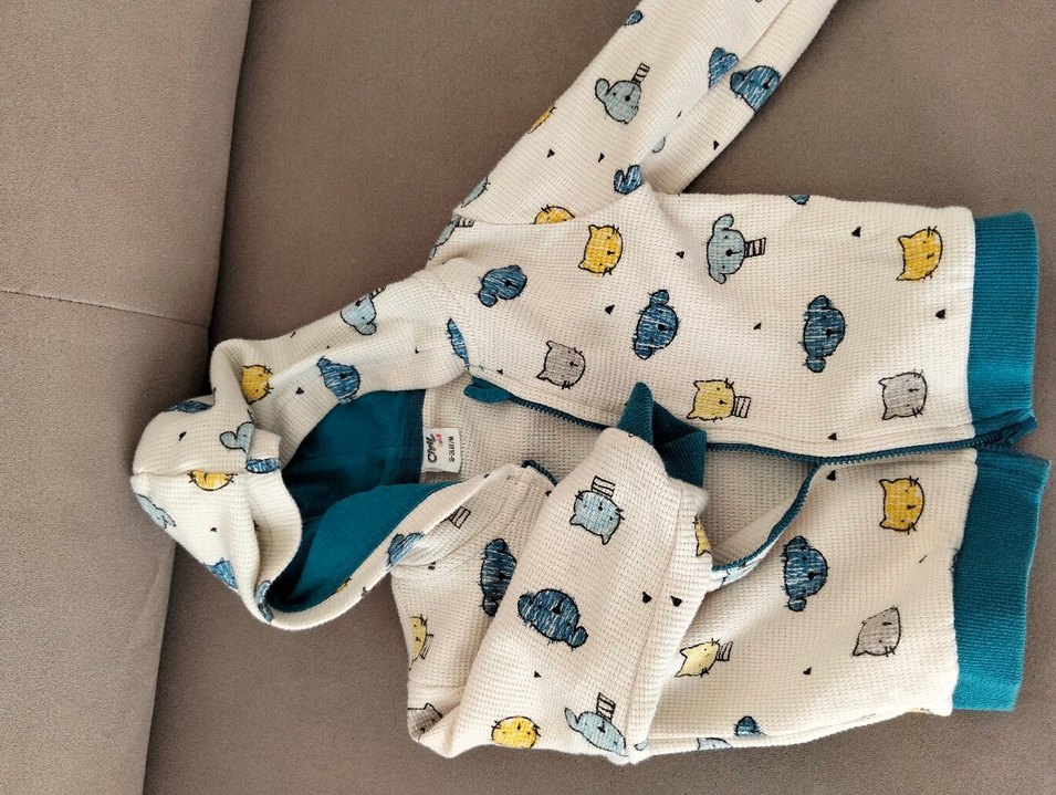 Uzun kollu, kapüşonlu ve fermuarlı bebek erkek hırka. Yumuşak dokulu, gayet canlı rengi ve hiç bir kusuru yoktur