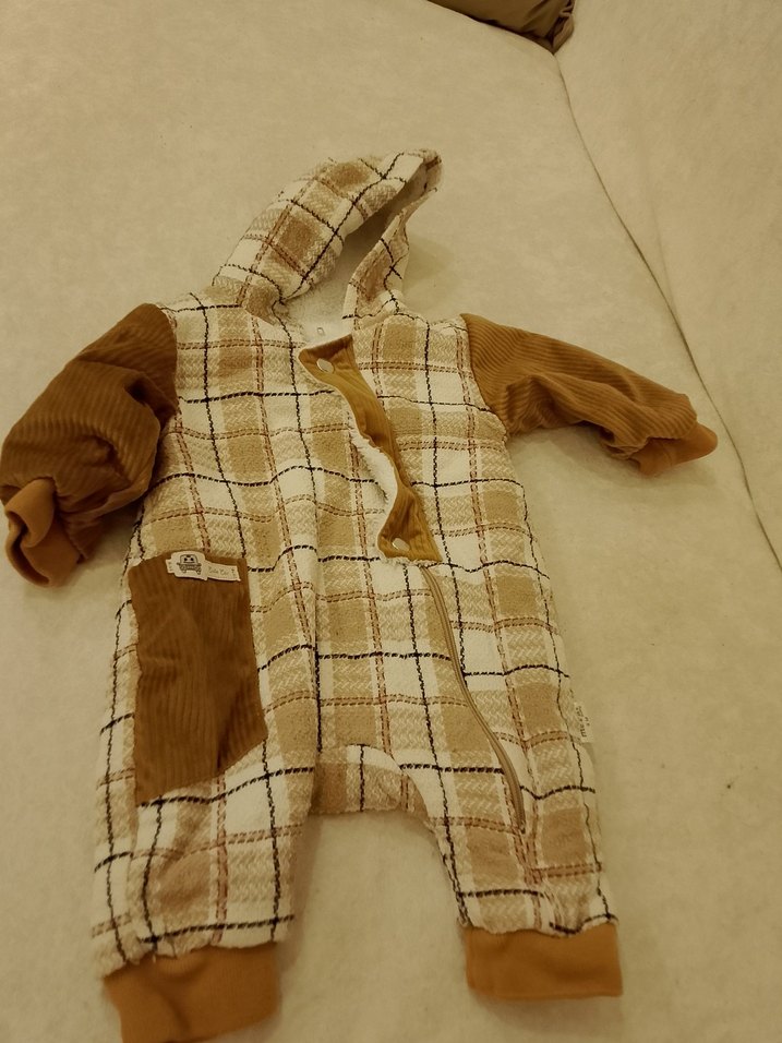 Kapüşonlu, düğmeli ve cepli bebek tulumu, yumuşak ve sıcak kumaştan, kahverengi ve gri kareli desende, sokak modası tarzında. ❄️
