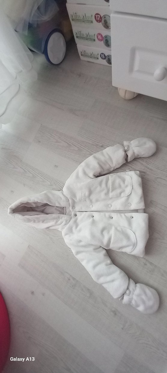 Kapüşonlu, düğmeli ve beyaz renkte, yumuşak ve sıcak kumaştan yapılmış mont. Desensiz ve sade tasarıma sahiptir.
