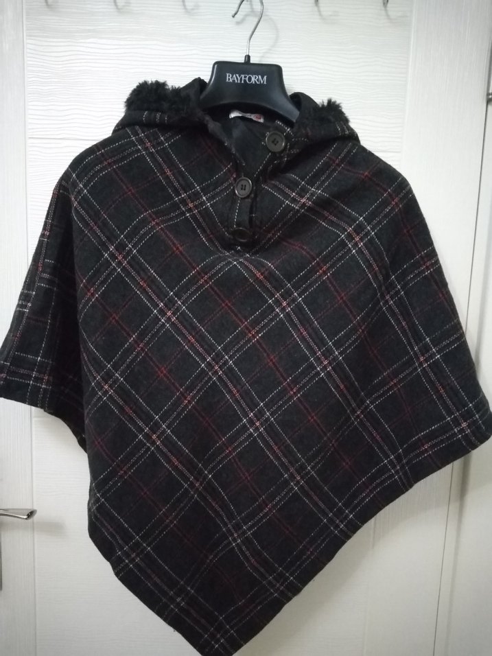 Kapüşonlu ve düğmeli, koyu gri ekose desenli panço. Yumuşak ve sıcak kumaştan, kısa kollu ve bol kesim, dış mekan kullanımı için uygundur. Marka: DİLVİN . S\M uyumlu. #kot #jean #orjinal #ceket #elbise #tulum #kemer #saat #pantolon #kazak #kadin #erkek # çocuk #bebek #ayakkabı #sandalet #terlik #makyaj #tișört #taki #trend #trendyol #moda