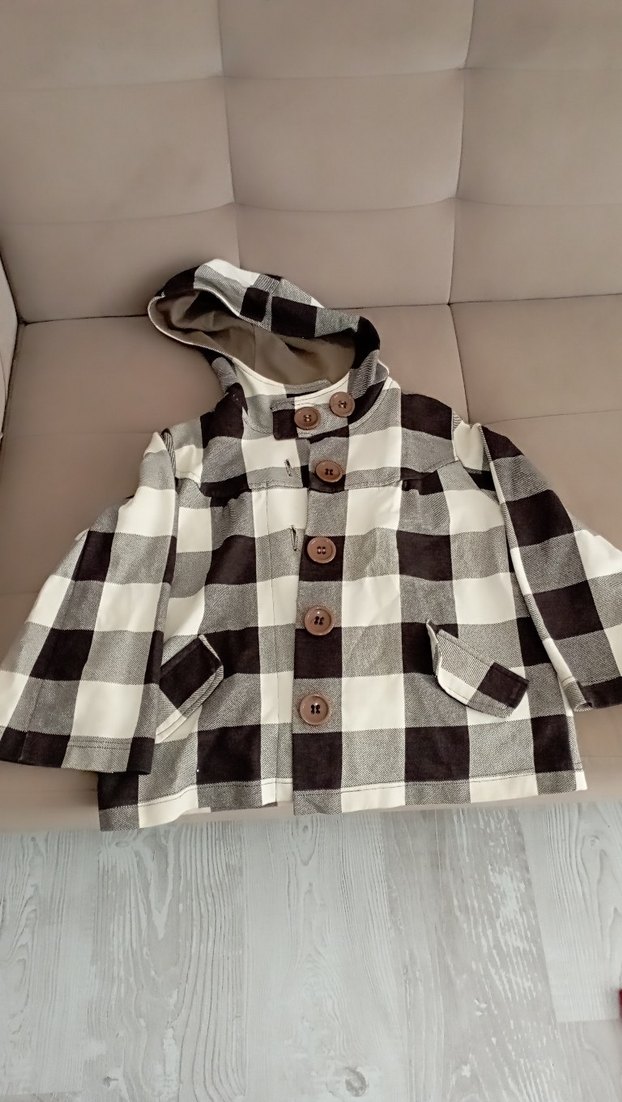 Bol kesim, uzun kollu ceketi. Kahverengi ve gri ekose desenli, düğmeli ve kapüşonlu. Yumuşak, rahat kumaştan midi boyda, günlük kullanım için uygun.