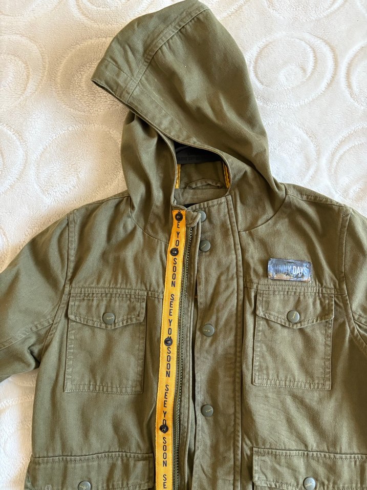 Düğmeli, kapüşonlu erkek çocuk ceketi, notched lapel yaka ve işlemeli detaylara sahiptir. Khaki renkte, rahat ve sıcak kumaştan üretilmiştir. hiç bir kusuru yoktur yeniden farksız pırıl pırıl