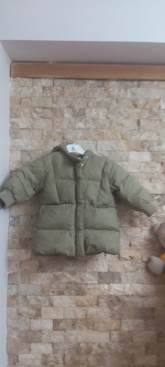 Kapüşonlu, düğmeli ve fitted kesime sahip erkek çocuk kabanı. Yumuşak ve sıcak dokulu kumaştan, düz yeşil renkte, street wear tarzında.