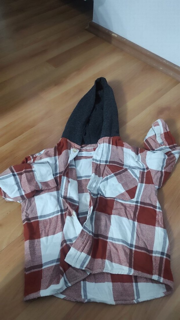 Bol kesim erkek gömleği, uzun kollu ve kapüşonlu. Yumuşak ve sıcak kumaştan, düğmeli ön kısmı ve gri kapüşonu bulunur. Sokak stili için uygundur.
